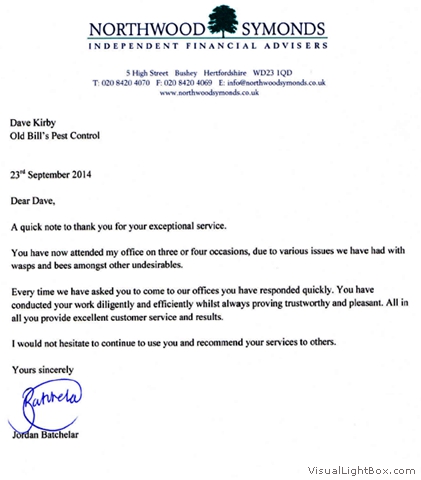 "Just to let you know that my wife and I were most impressed from the service we received from Old Bill Pest Control.Chris, your technician, is certainly a credit to your company.He was at all times most professional, very helpful-he also has an extremely pleasant manner.